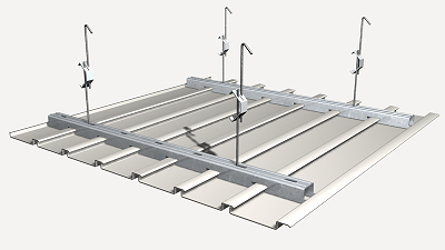 Support de suspension de plafond, en acier galvanisé, pour faux plafonds démontables à lames.
