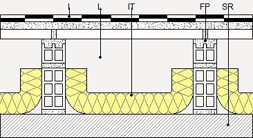 Toiture terrasse froide, inaccessible, autoprotégée, de type conventionnel, pente de 1% à 15%. FORME DE PENTES: panneau céramique creux à rainure et languette de 80x25x3,5 cm avec couche de régularisation de mortier de ciment, confectionné sur chantier, dosage 1:6, de 3 cm d'épaisseur, finition talochée, sur cloisons allégées de brique creuse en terre cuite de 29x14x9 cm, pose avec du mortier de ciment, confectionné sur chantier, dosage 1:6, disposées tous les 80 cm et avec 30 cm de hauteur moyenne, arrêts supérieurs avec des guides de mortier de ciment, confectionné sur chantier, dosage 1:6; ISOLATION THERMIQUE: feutre isolant en laine minérale; IMPERMÉABILISATION: type bicouche, adhérée, composée de membrane en bitume modifié par élastomère SBS, LBM(SBS)-30-FV, impression préalable avec émulsion bitumineuse anionique avec charges, et membrane en bitume modifié par élastomère SBS, LBM(SBS)-40/G-FP adhérée à la précédente avec un chalumeau, sans coïncidence des joints.