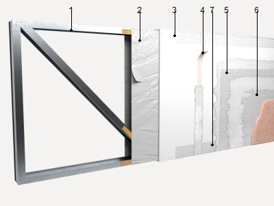 Mise en place et fixation provisoire de l'imperméabilisation. Mise en place et vissage des plaques à la structure. Traitement des joints. Mise en place du profilé d'arrêt en angle. Extension de la couche de mortier base et mise en place de la maille. Application de la couche d'apprêt. Application de la couche de finition.