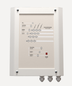 Centrale de détection automatique de gaz, analogique, pour 2 zones, de 355x260x85 mm, avec degré de protection IP43, 2 barres de DELs indiquant l'état de fonctionnement, l'état des détecteurs et la concentration de gaz mesurée par le détecteur de chaque zone, 3 niveaux d'alarme, 3 relais de sortie, un de 230 V, un de 12 Vdc et un avec les contacts libres de tension, pour chaque niveau d'alarme et source d'alimentation de 230 V, selon NF EN 60079-29-1.