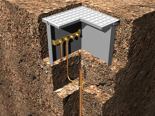 Prise de terre composée de piquet en acier cuivré de 2 m de longueur, enfoncé dans le terrain, connecté à barrette de mesure, dans un regard en polypropylène de 30x30 cm. Comprend le boulon en U pour la connexion du piquet au conducteur de terre et les additifs pour diminuer la résistivité du terrain.