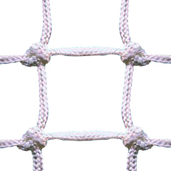 Filet de sécurité NF EN 1263-1 S A2 M100 D M, de polyamide de haute ténacité, noué, de couleur blanche. Corde de filet de calibre 4,5 mm. Énergie du filet A2 (entre 2,2 et 4,4 kJ). Configuration du filet en losange, avec ralingue en polypropylène de 16 mm de diamètre.