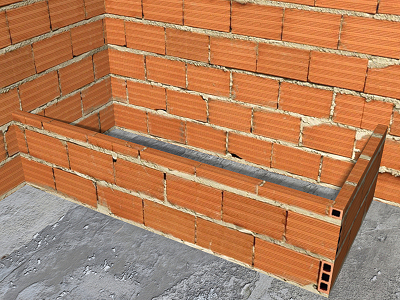 Habillage de baignoire avec des briques creuses simples en terre cuite, mise en place avec du mortier de ciment, confectionné sur chantier, dosage 1:6.